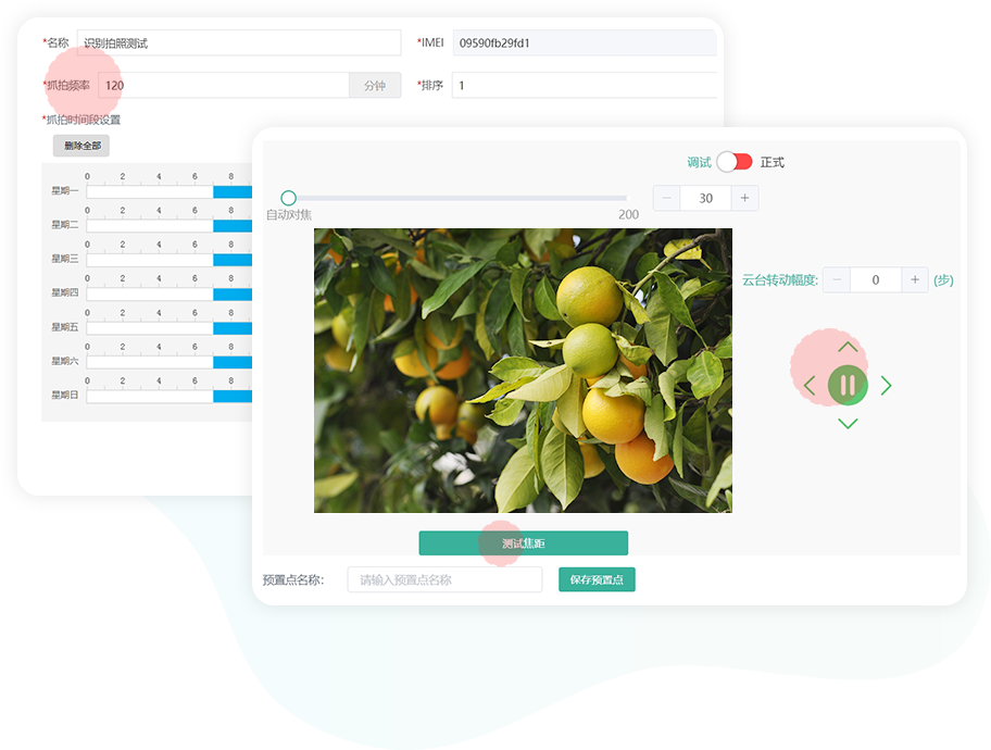 水平340°、垂直94°旋轉(zhuǎn),自動對焦,全向近景監(jiān)控,實現(xiàn)高清監(jiān)測作物和果樹植株上的每個果、莖、葉的生長的微變化及病蟲害情況。同時,還可實現(xiàn)遠距離高清拍攝,全面監(jiān)控作物生長環(huán)境。
